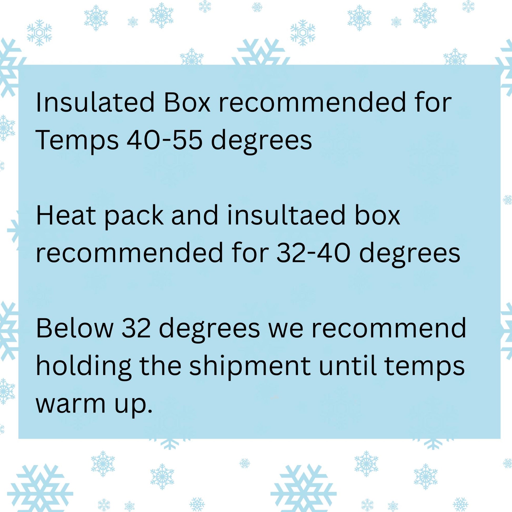 Order your Winter Shipping Packing Supplies Kit today to prepare for the cold seasons. We are committed to quality service and fast shipping, helping your business thrive all year round.$10 Winter Shipping Packing-Recommended for temps below 40 degrees. Includes 72 hour heat pack, foil lined insulation.
